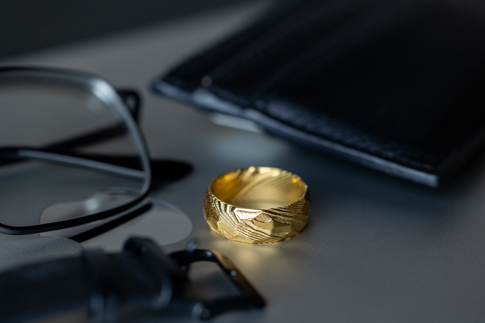 Golden Damascus - Hammered Gold Damascus Steel Ring, 4mm Width