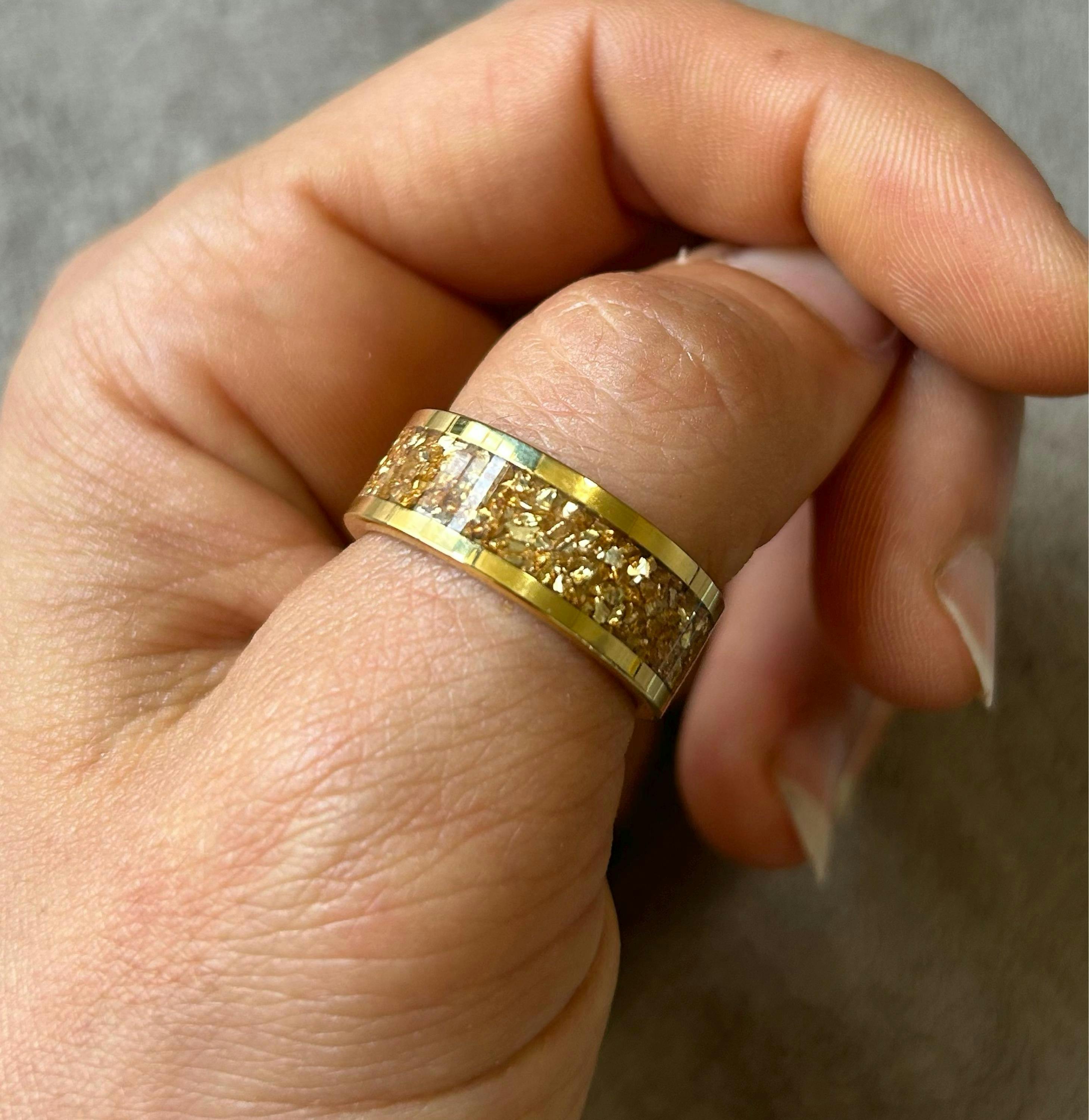 Looking for a ring that's both enduring and elegant? This 8mm band is crafted from incredibly strong tungsten carbide and lavishly plated with genuine 24K gold. The sleek, flat surface provides a modern canvas for the captivating golden ore inlay, a subtle yet luxurious detail. The high-polished finish ensures a brilliant shine that will last, making this ring a timeless addition to your collection.