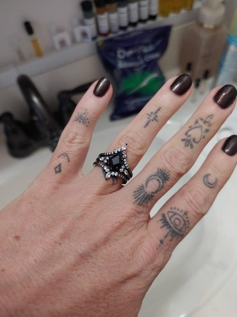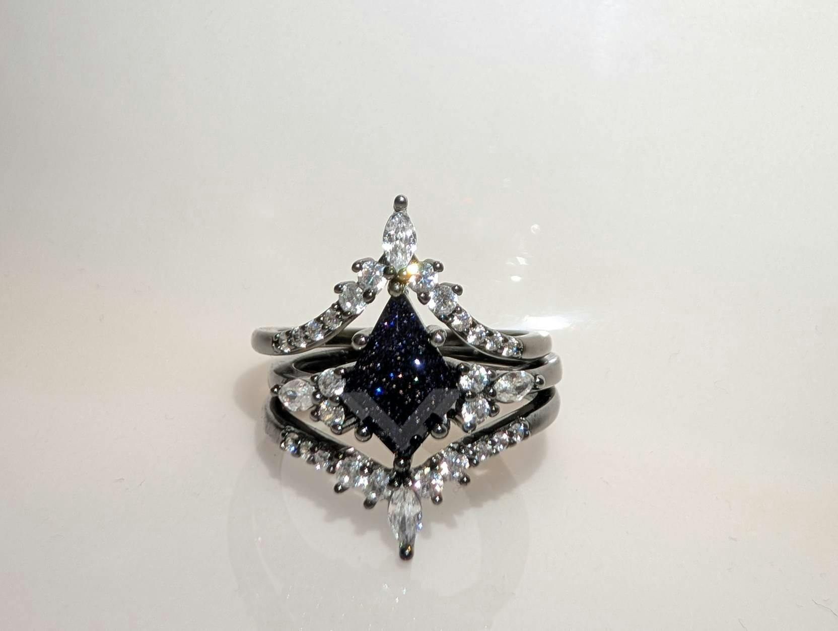The ring set features stunning Blue Galaxy Sandstone stones in a kite shape, set in 925 sterling silver with black plating, giving the rings a unique and captivating appearance. This piece beautifully blends sophistication and simplicity, making it a striking statement.