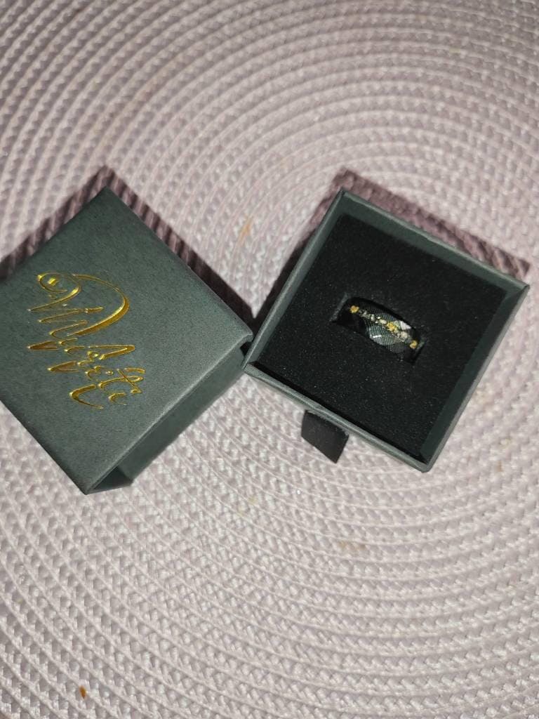 Damascus Meteorite & Crushed Gold Band, a breathtaking and distinctive piece of jewelry that is certain to make a bold statement. This ring features a one-of-a-kind hammered striped black pattern, adding a touch of masculinity to its design.
