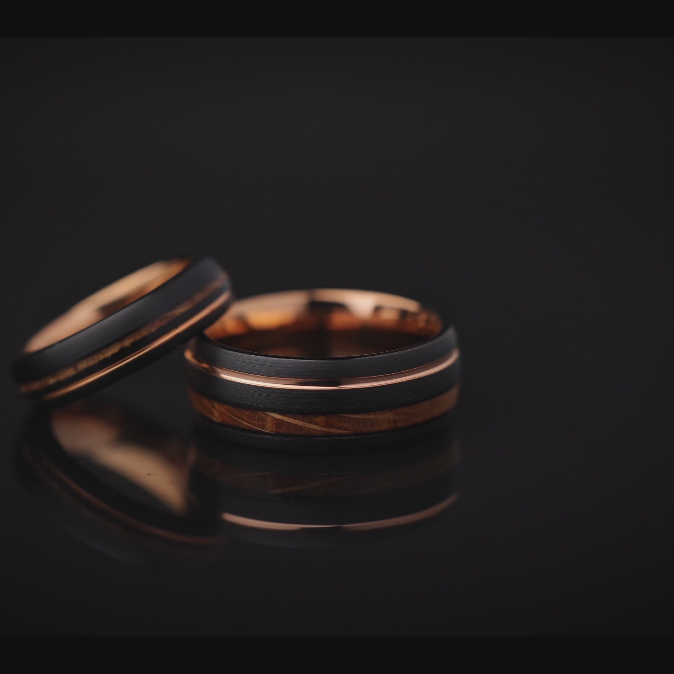 This stunning tungsten carbide ring features a domed matt surface with a rich brown plating. A unique inlay of whiskey barrel wood adds a touch of rustic elegance, while the two polished black edges provide a sophisticated contrast. The inner surface of the ring is highly polished for comfort and durability.