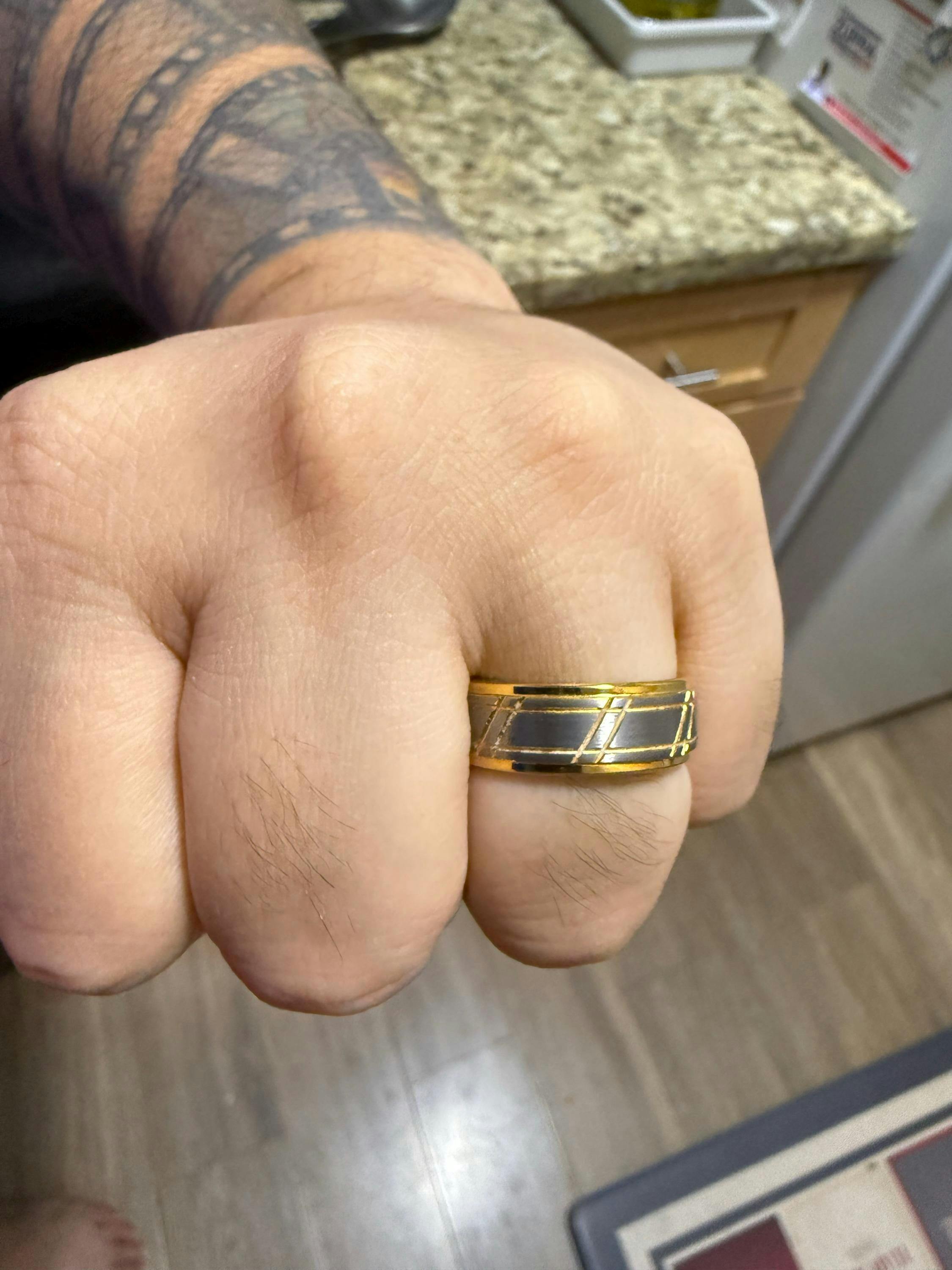 Indulge in the epitome of luxury with this exquisite tungsten carbide ring, a masterpiece of modern design and timeless elegance. Its 8mm flat surface provides a sleek and sophisticated foundation, while the gleaming 24k gold plating exudes an aura of opulence. The ring's true brilliance lies in its captivating interplay of textures, featuring a natural color in matt slotting juxtaposed against a brushed surface in gold plated. This harmonious blend of contrasting textures creates a captivating visual effect, adding depth and dimension to the ring's design. The inner surface of the ring is meticulously polished for exceptional comfort and durability.