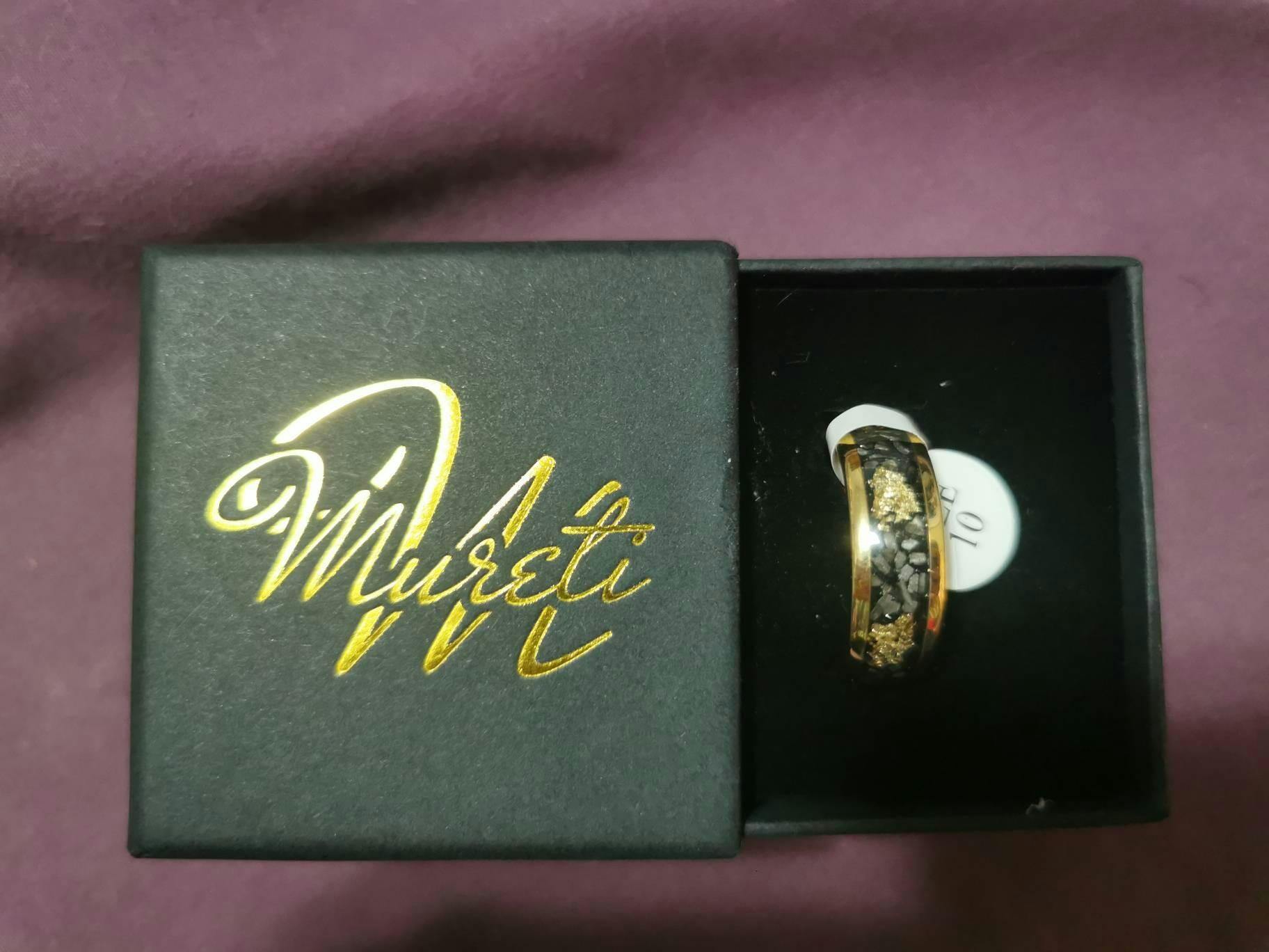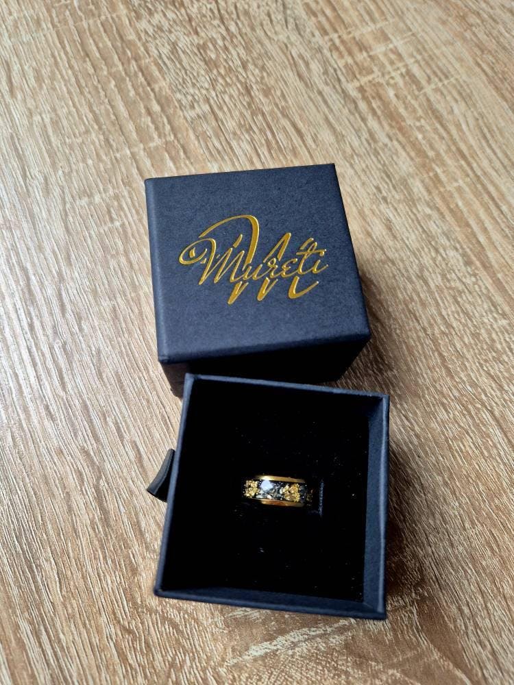 This 8mm tungsten carbide ring exudes luxury with its 24K gold-plated, domed surface. The inlay features a striking combination of a black stand, shimmering meteorite fragments, and delicate gold leaf accents, creating a stunning visual effect. The high-polished finish adds a touch of elegance, making this ring a perfect blend of modern design and timeless sophistication. Ideal for those who seek a unique and luxurious accessory, this ring is a symbol of enduring strength and celestial beauty.