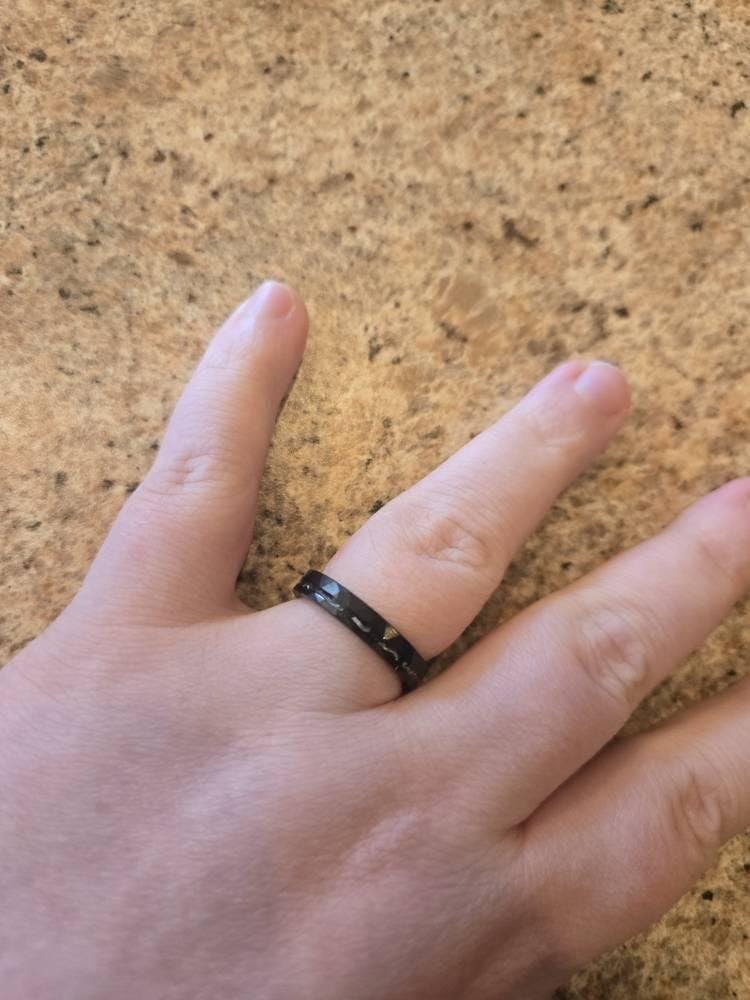 A black meteorite ring maintains a unique design while standing out with its stylish elements. This piece is more than just a wedding band for women; it's a statement of style, comfort, and enduring commitment.