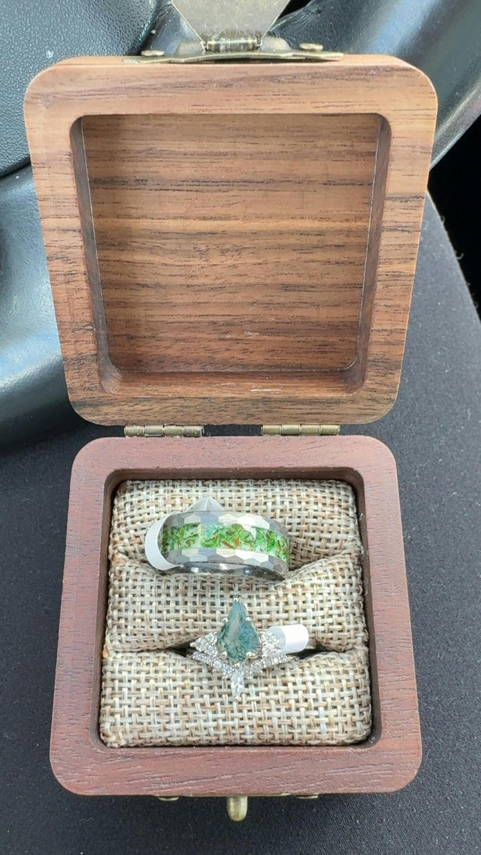 This stunning hammered moss agate ring is the perfect way to add a touch of nature and sophistication to your style. The ring features a moss agate that is set in a hammered natural metallic gray color tungsten band. The moss agate is known for its calming and grounding properties, and it is said to bring peace and harmony to the wearer. The natural color tungsten band is scratch-resistant and durable, making it the perfect choice for everyday wear.