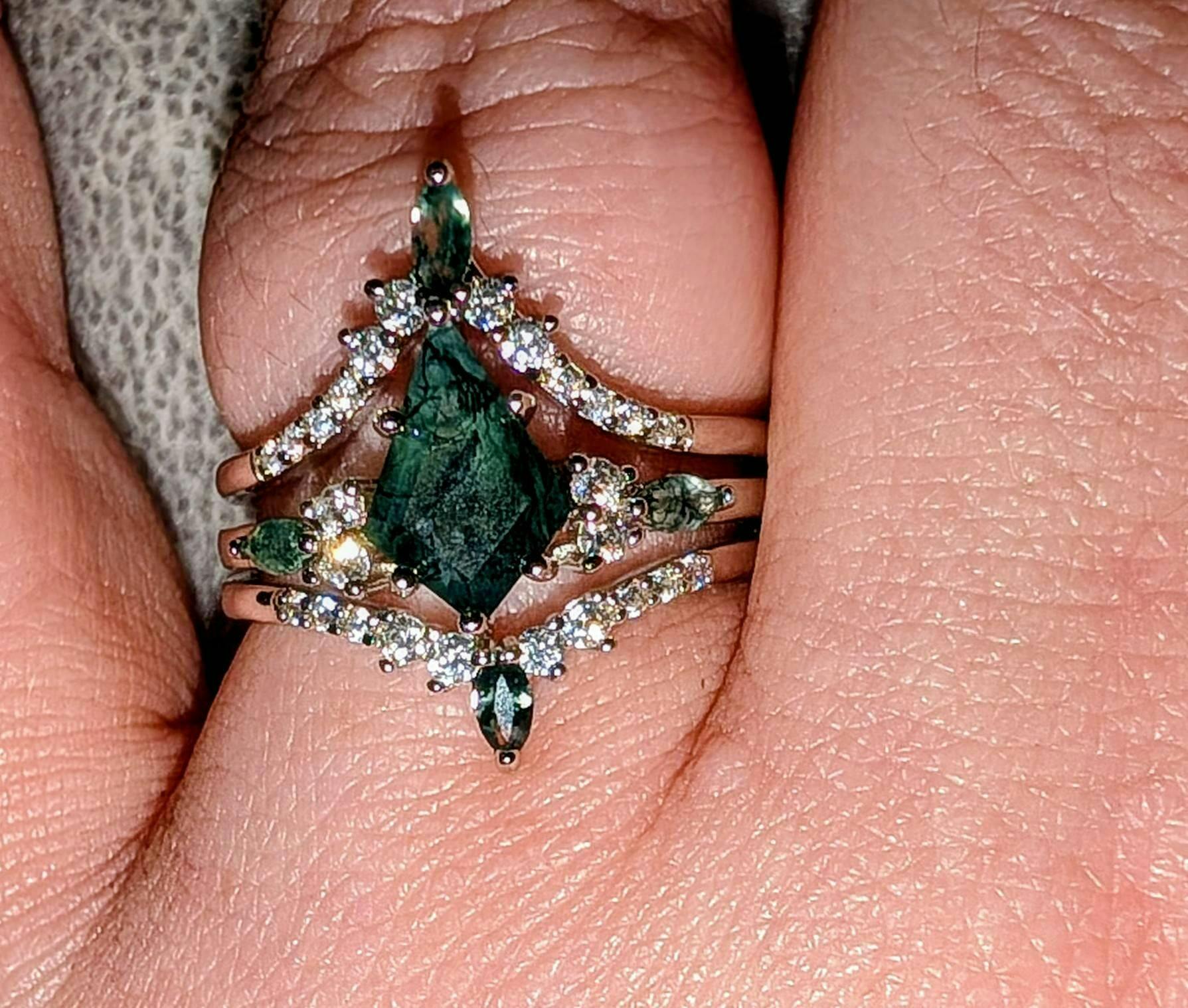 Capture the beauty of nature with this Moss Agate Silver Ring, designed with a striking kite-cut natural Moss Agate stone. Surrounded by shimmering simulated diamonds and crafted in silver, this ring offers a perfect balance of elegance and uniqueness. A thoughtful gift for her or a special piece to elevate your own jewelry collection.