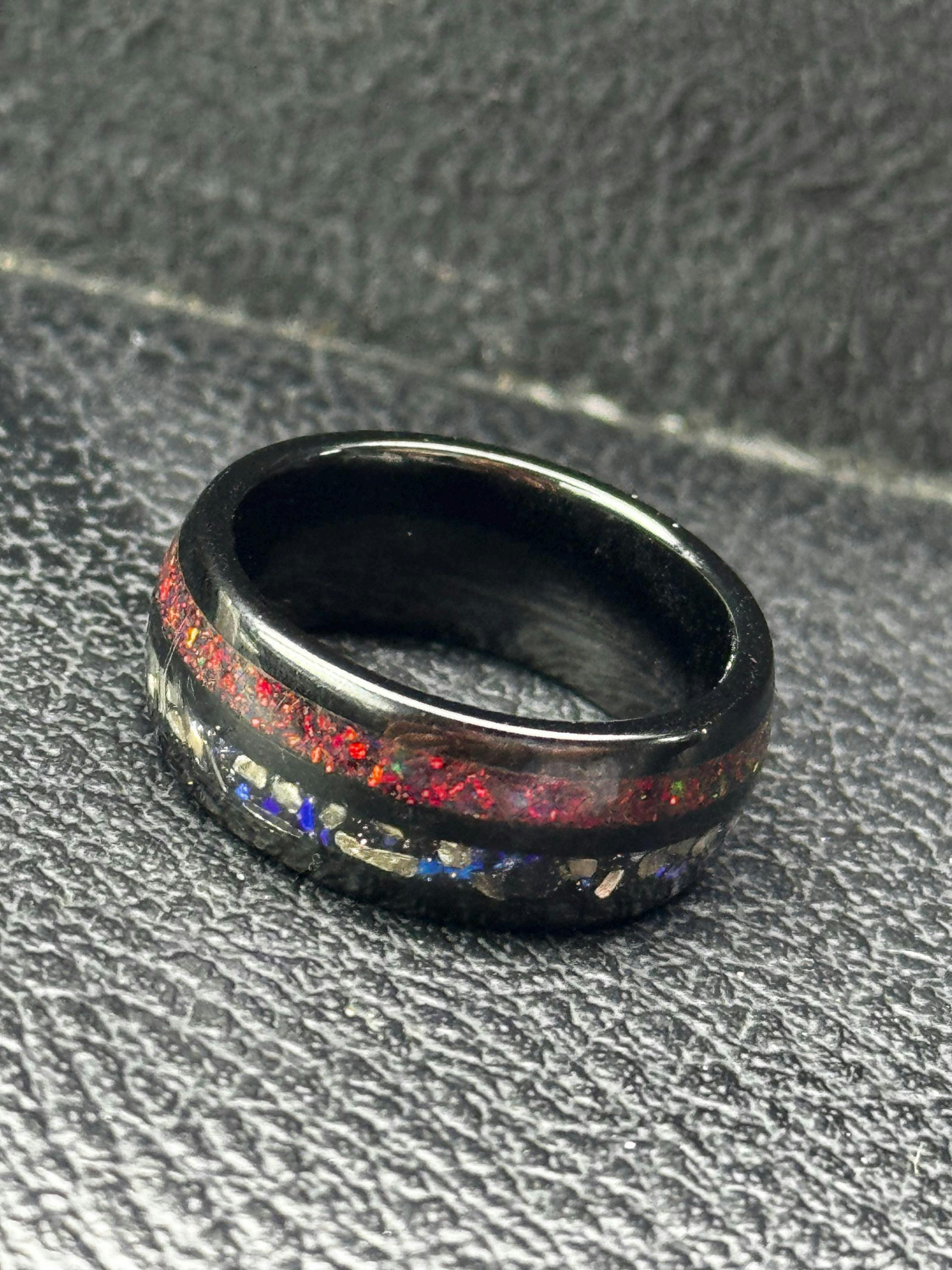 This striking black tungsten ring features a captivating double inlay design, perfect for the man who embraces the extraordinary. The first inlay showcases a mesmerizing nebula pattern adding a touch of cosmic wonder. Alongside it, a vibrant inlay of crushed red fire opal brings a fiery contrast, creating a ring that's both bold and sophisticated.