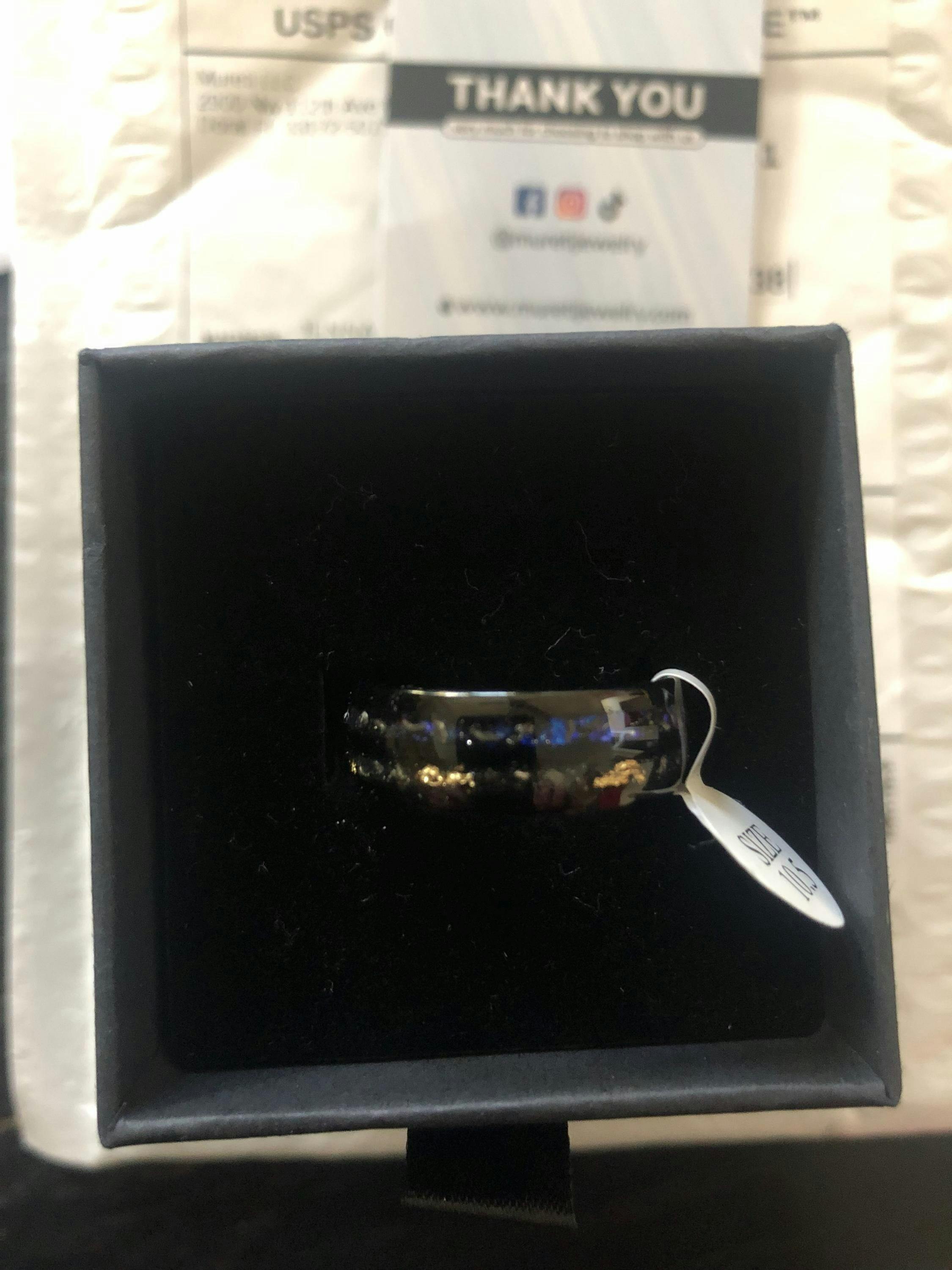 This ring is crafted from black tungsten carbide and has the two inlays, one featuring a nebula space galaxy and the other made from crushed meteorite gold leaf, add a touch of otherworldly beauty to the ring.