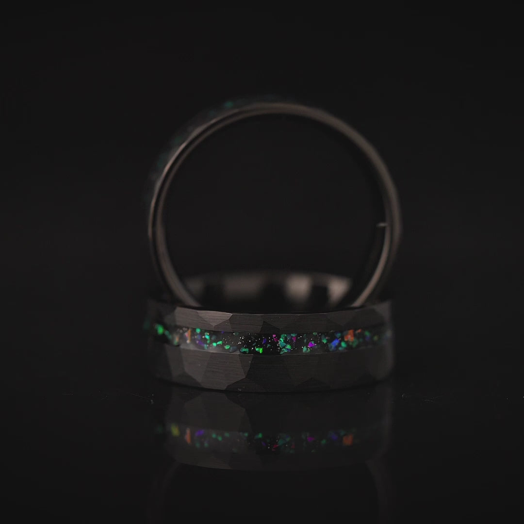 This ring is a perfect choice for any man seeking a distinctive piece of jewelry that stands out from the crowd. The harmonious blend of the hammered black finish and the striking opal inlay creates a unique and modern aesthetic. It is the ideal way to express your commitment and love to your partner or to present as a memorable and one-of-a-kind gift.