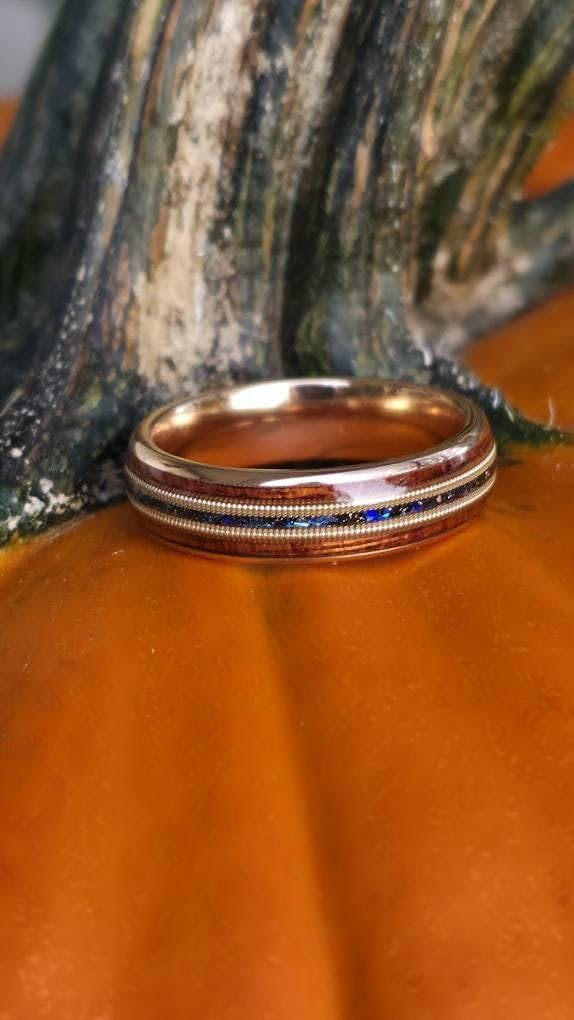 Discover the enchanting blend of nature and elegance with this Opal Wood Ring, featuring a Rose Gold Tungsten Wood Band. The rich tones of Hawaiian Koa wood are beautifully complemented by vibrant blue opal inlays, creating a stunning contrast that captures the essence of the ocean and earth. The warm hue of the rose gold tungsten band adds a touch of luxury, making it an ideal choice for a wedding band or special occasion. Designed for men who appreciate both style and substance, this 8mm ring is a symbol of enduring love and natural beauty. Let this unique piece of craftsmanship bring the spirit of the islands to your everyday wear.