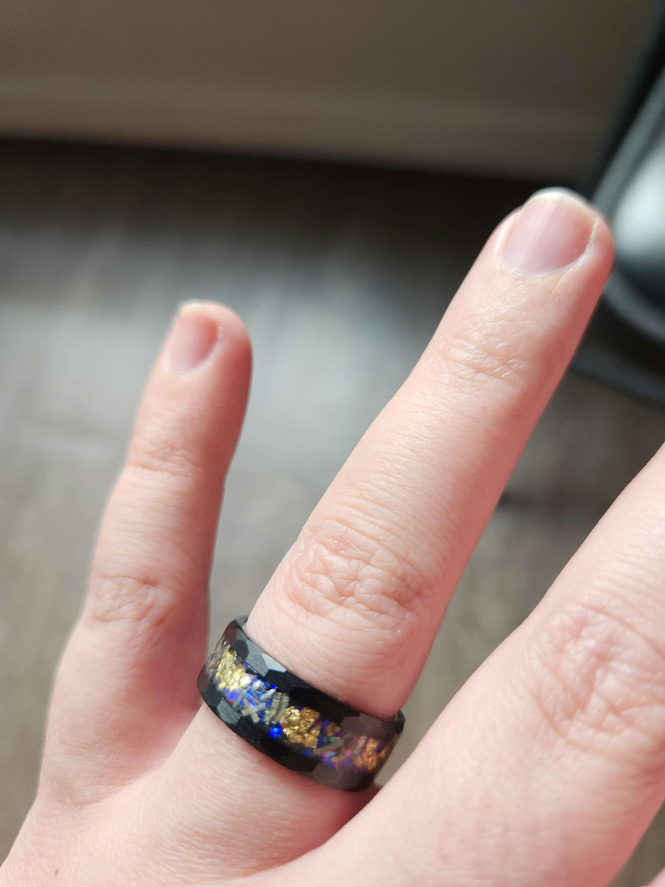 The centerpiece of this ring is the mesmerizing inlay, showcasing a galaxy, flecked with gold leaf. Crushed meteorite adds an otherworldly touch, creating a truly out-of-this-world look.